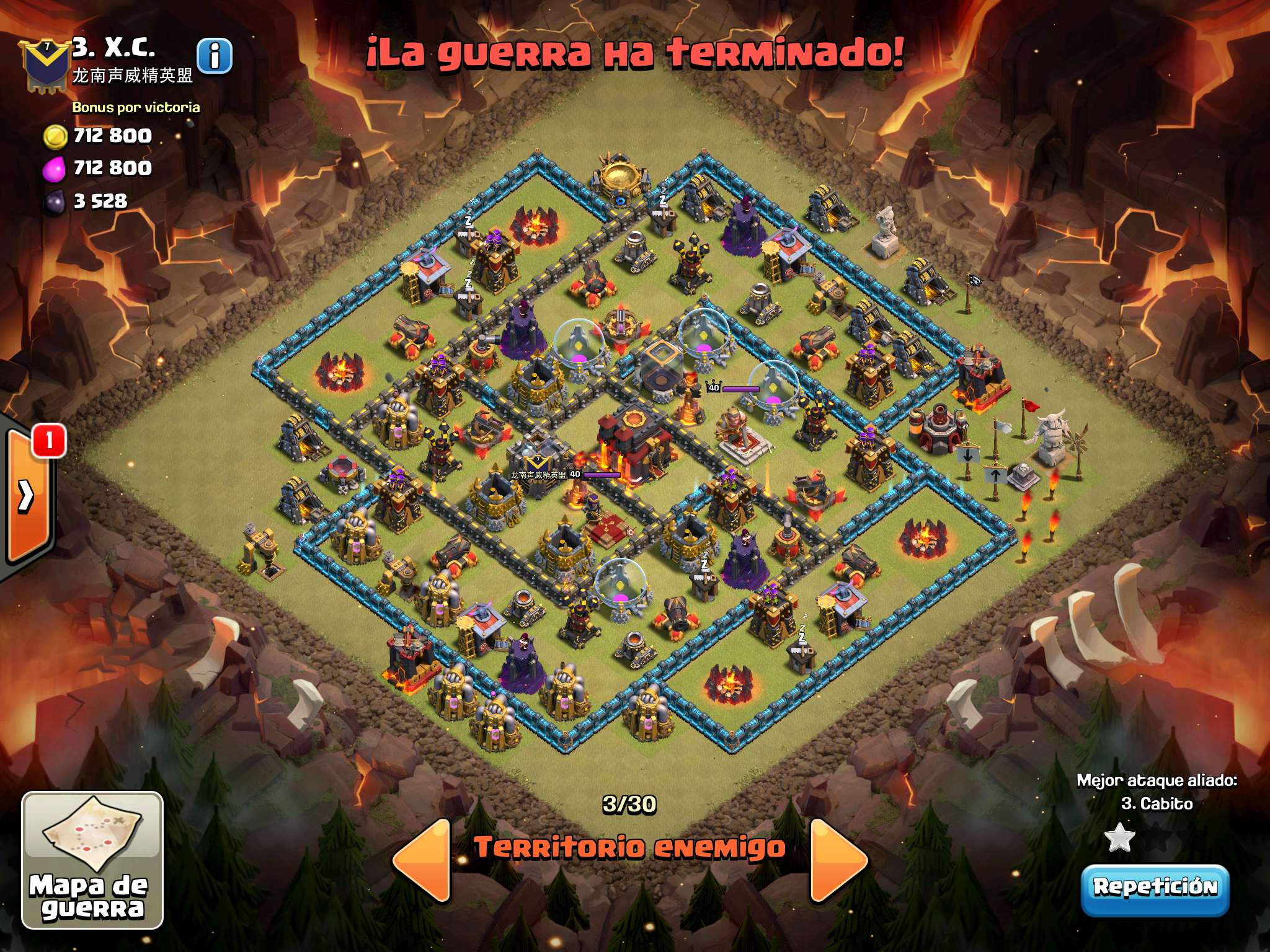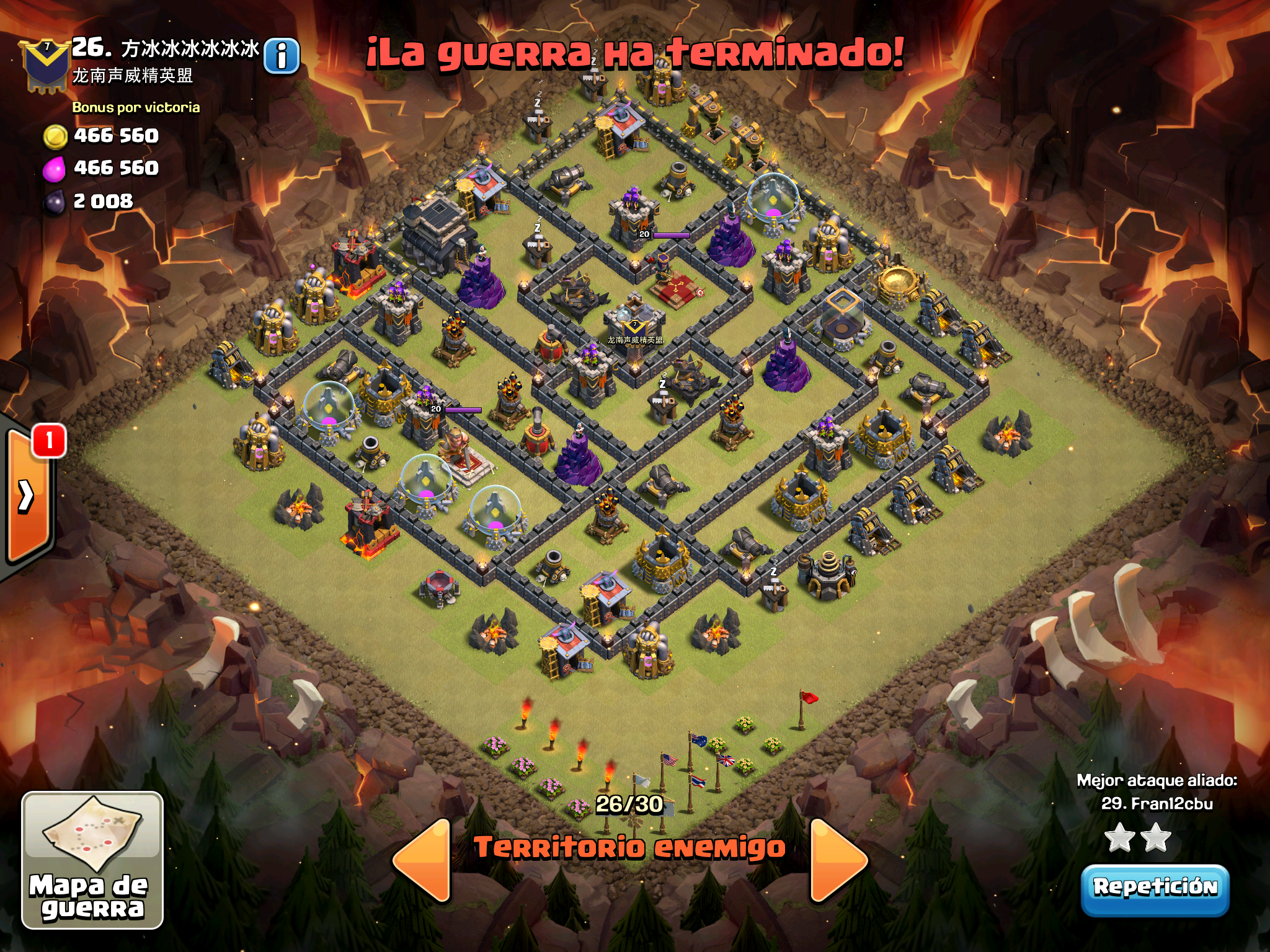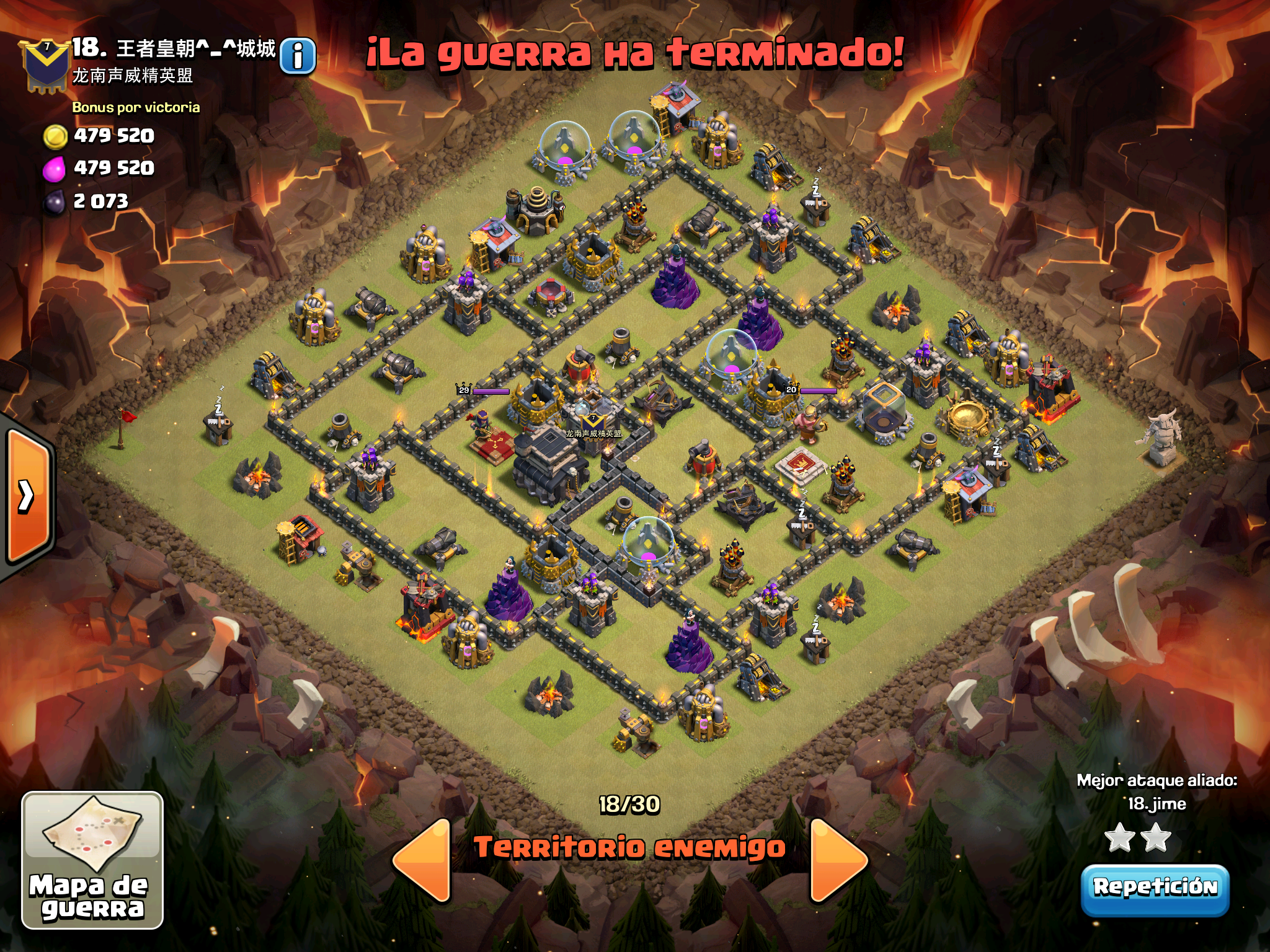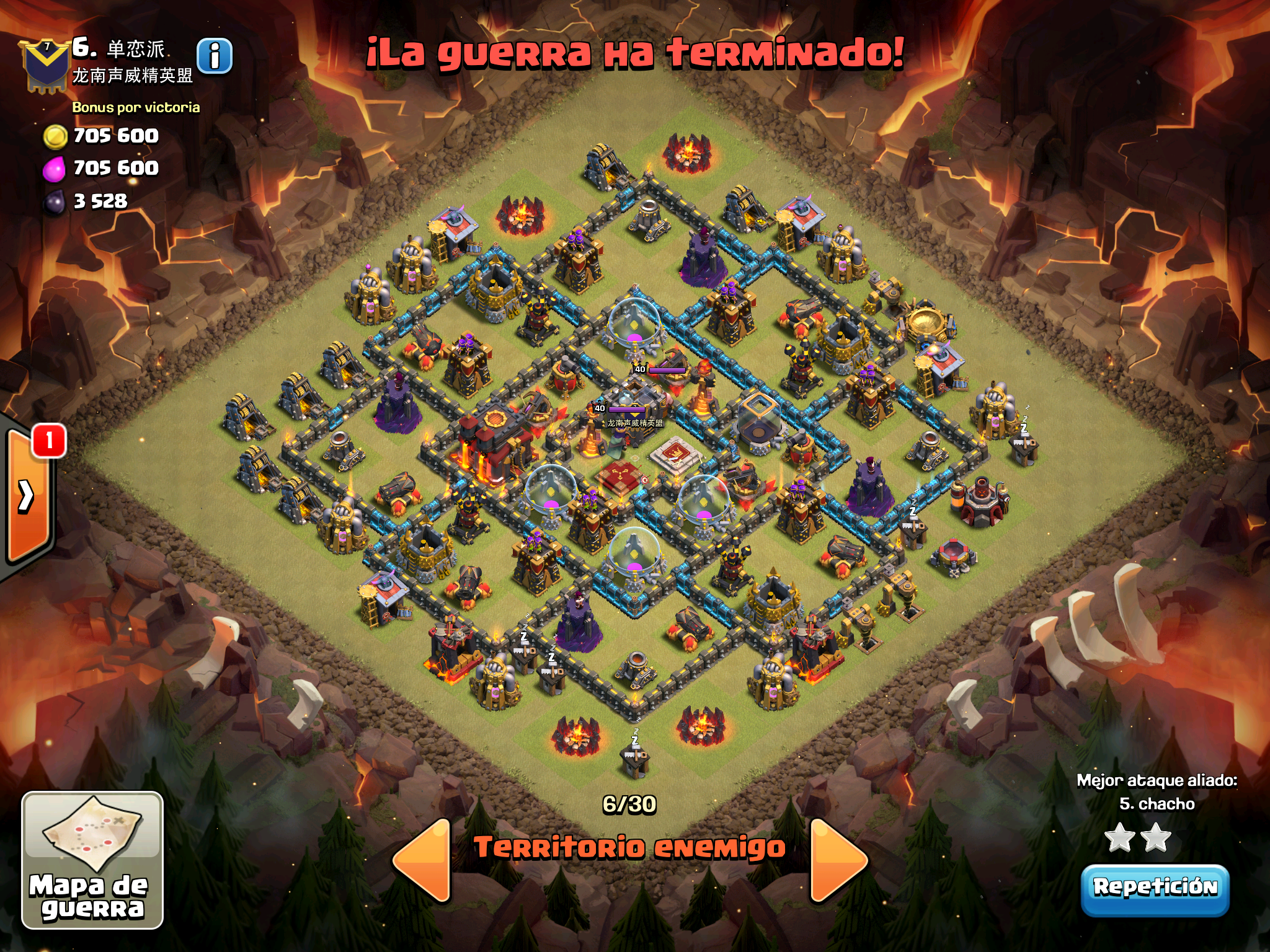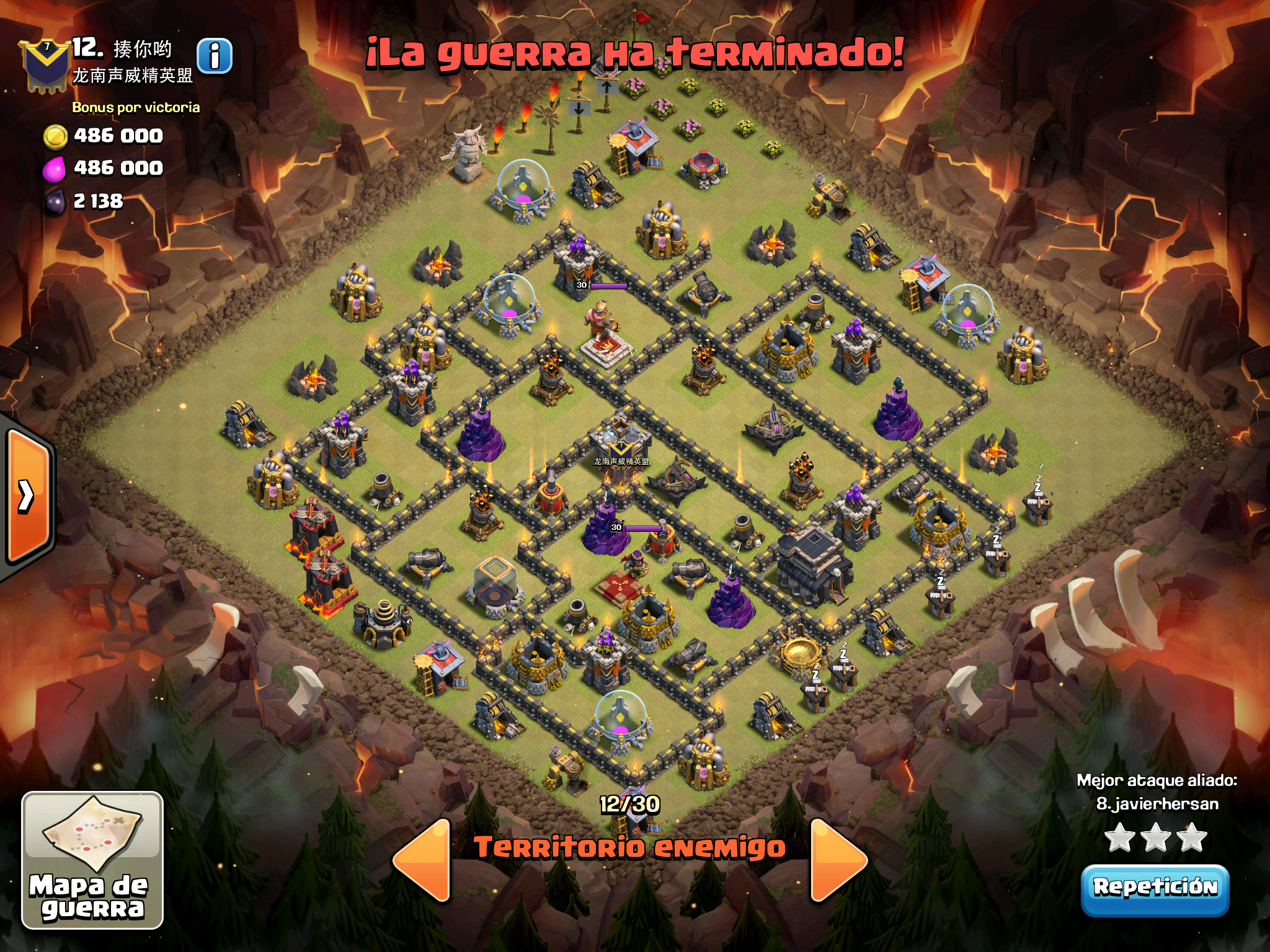 Pues si pensabais que la guerra contra Supremacia Br estaba desequilibrada esta lo vais a flipar.: Todos los TH10 de este clan chino estan al MAXIMO de defensas y heroes. TODOS. Los TH9 hasta bastante abajo calzan tambien heroes 30 y muros al 10… asi que cuando empeze a mirar la guerra lo flipe.