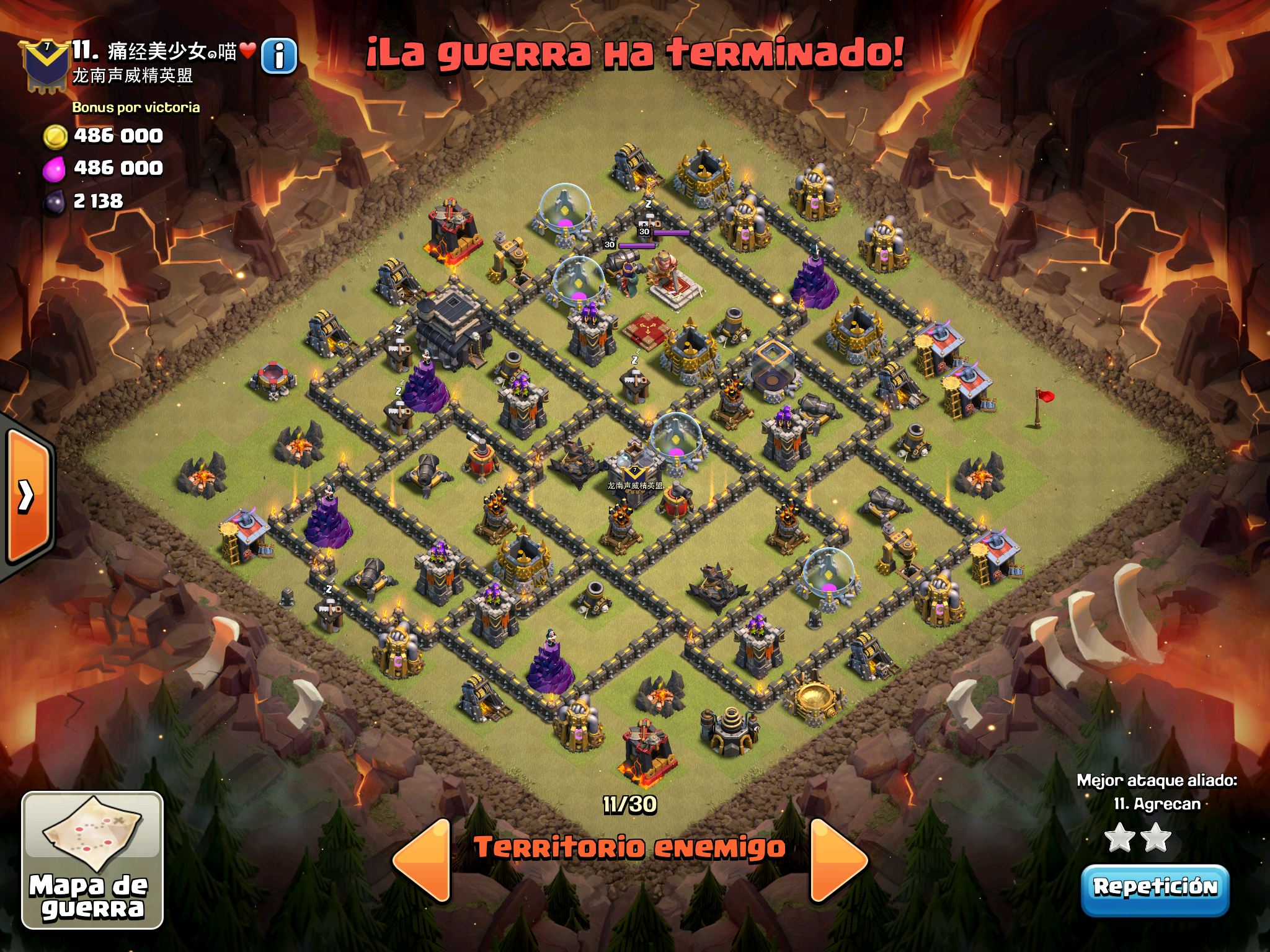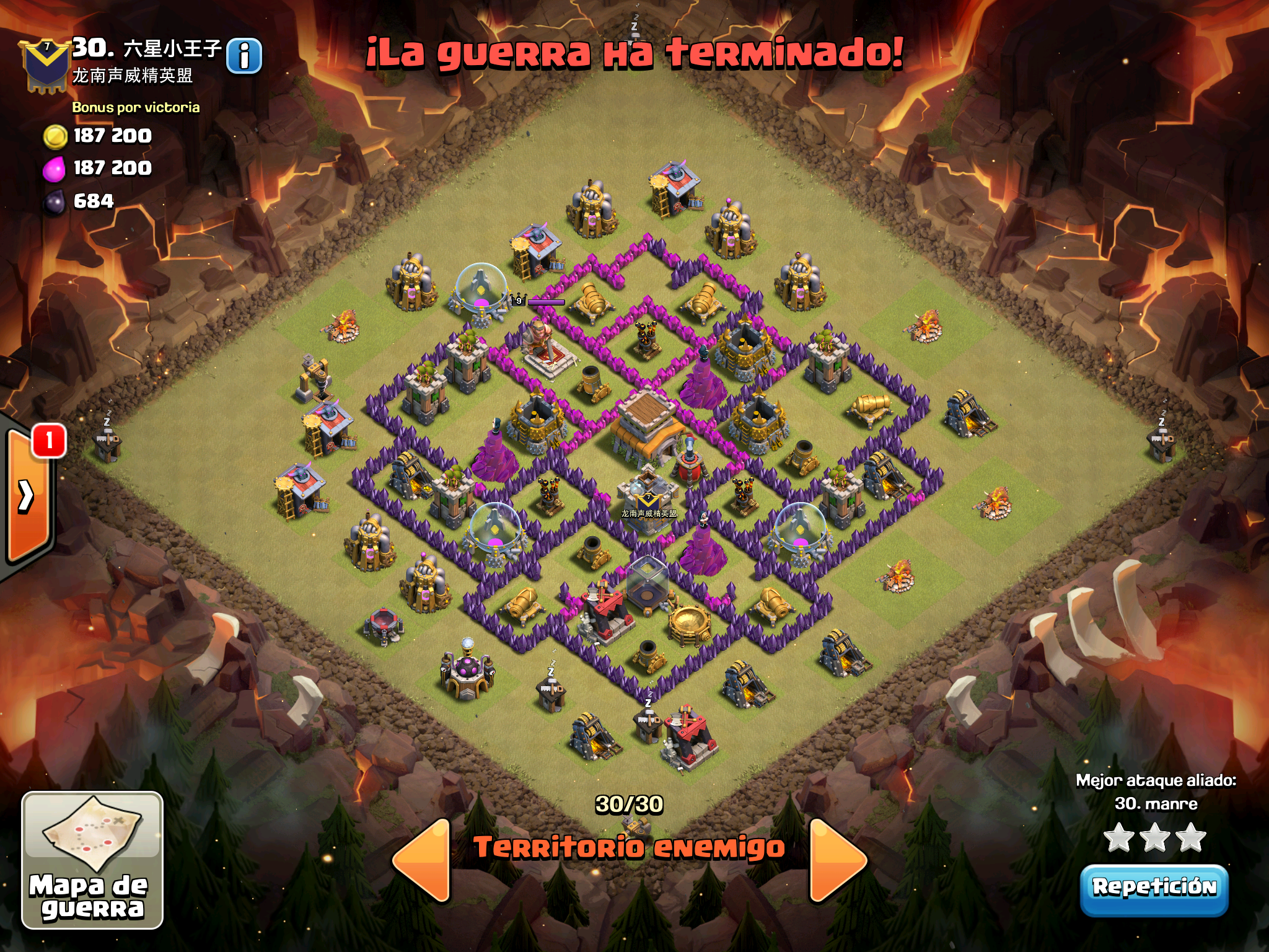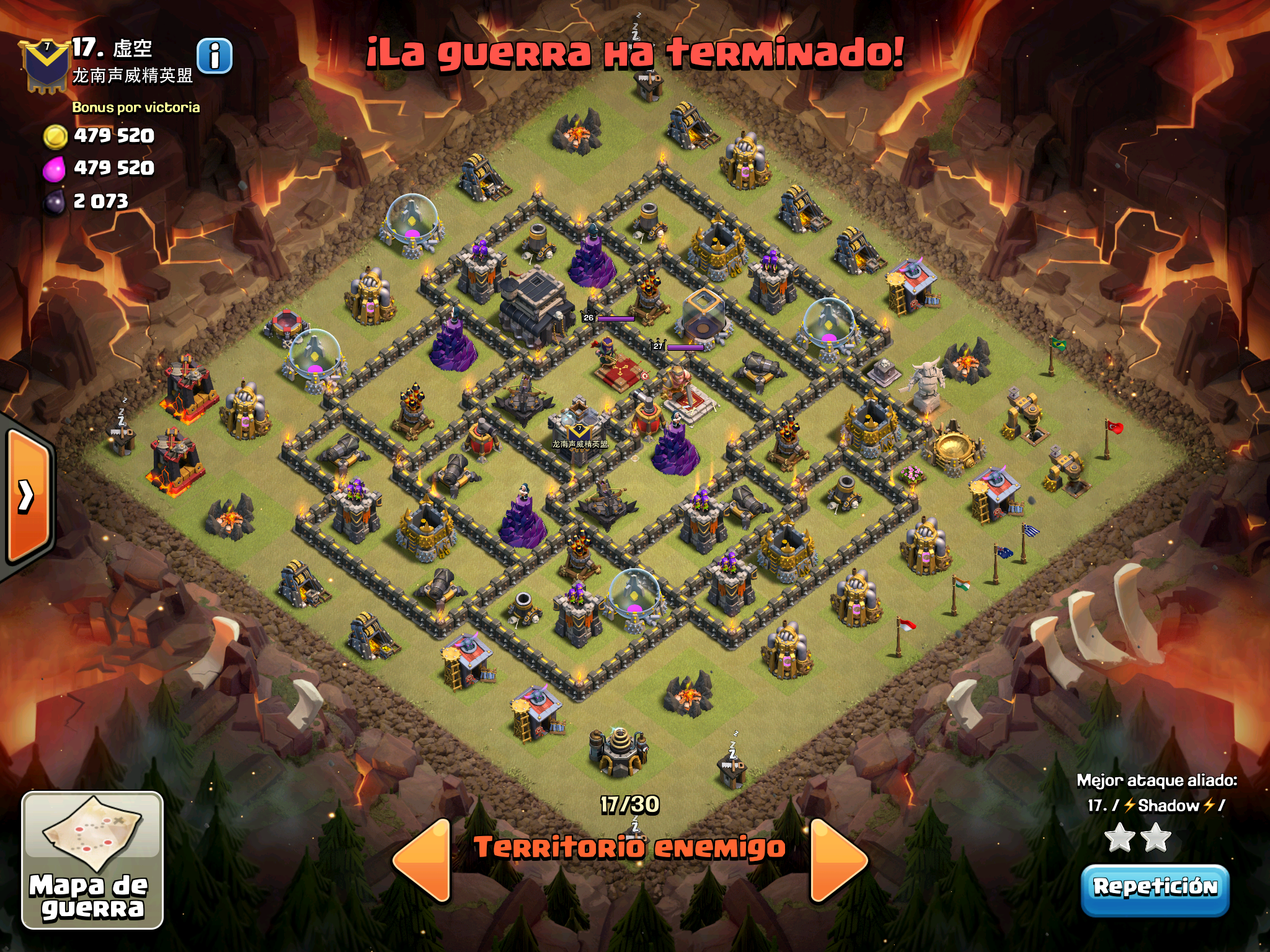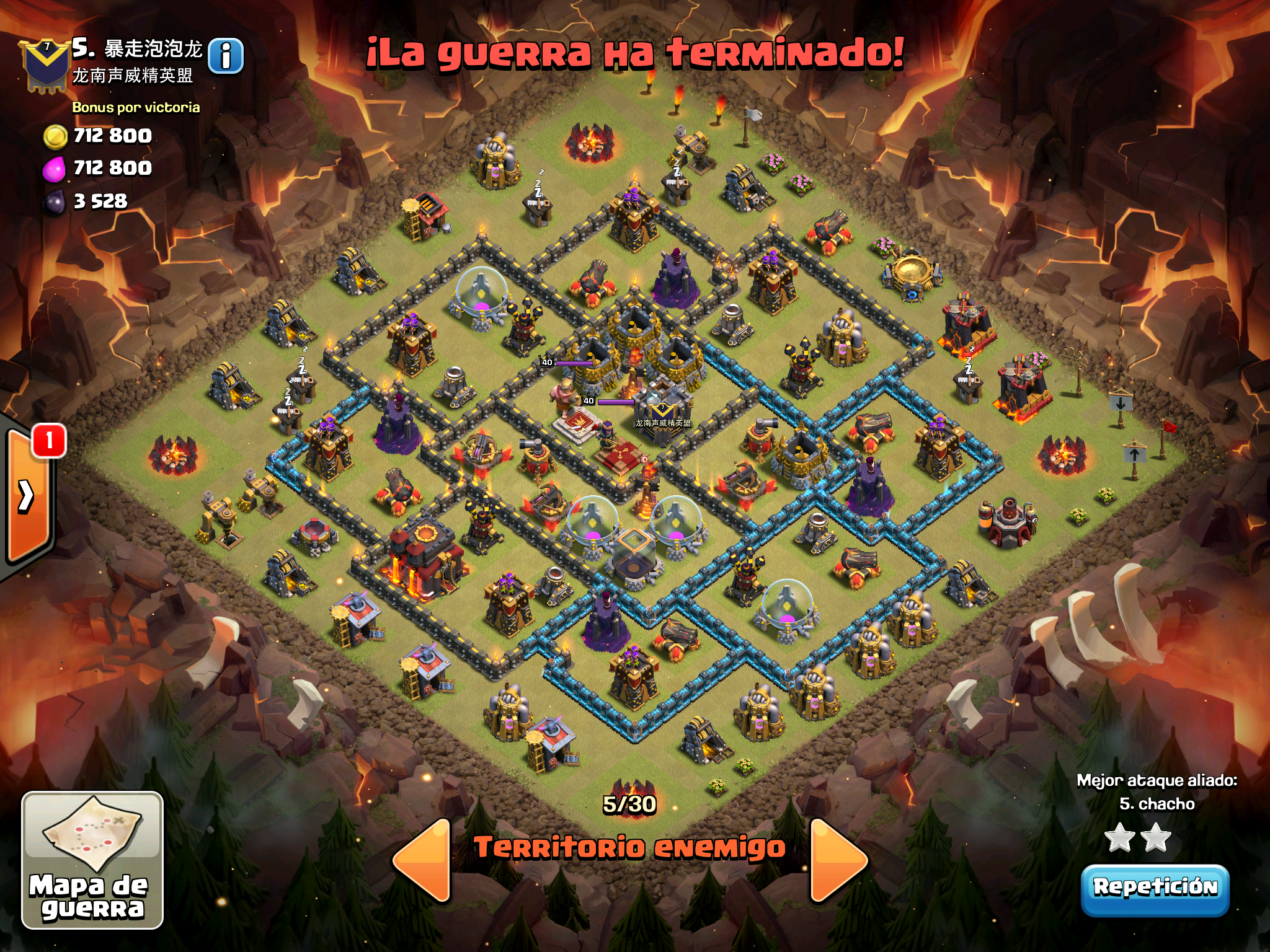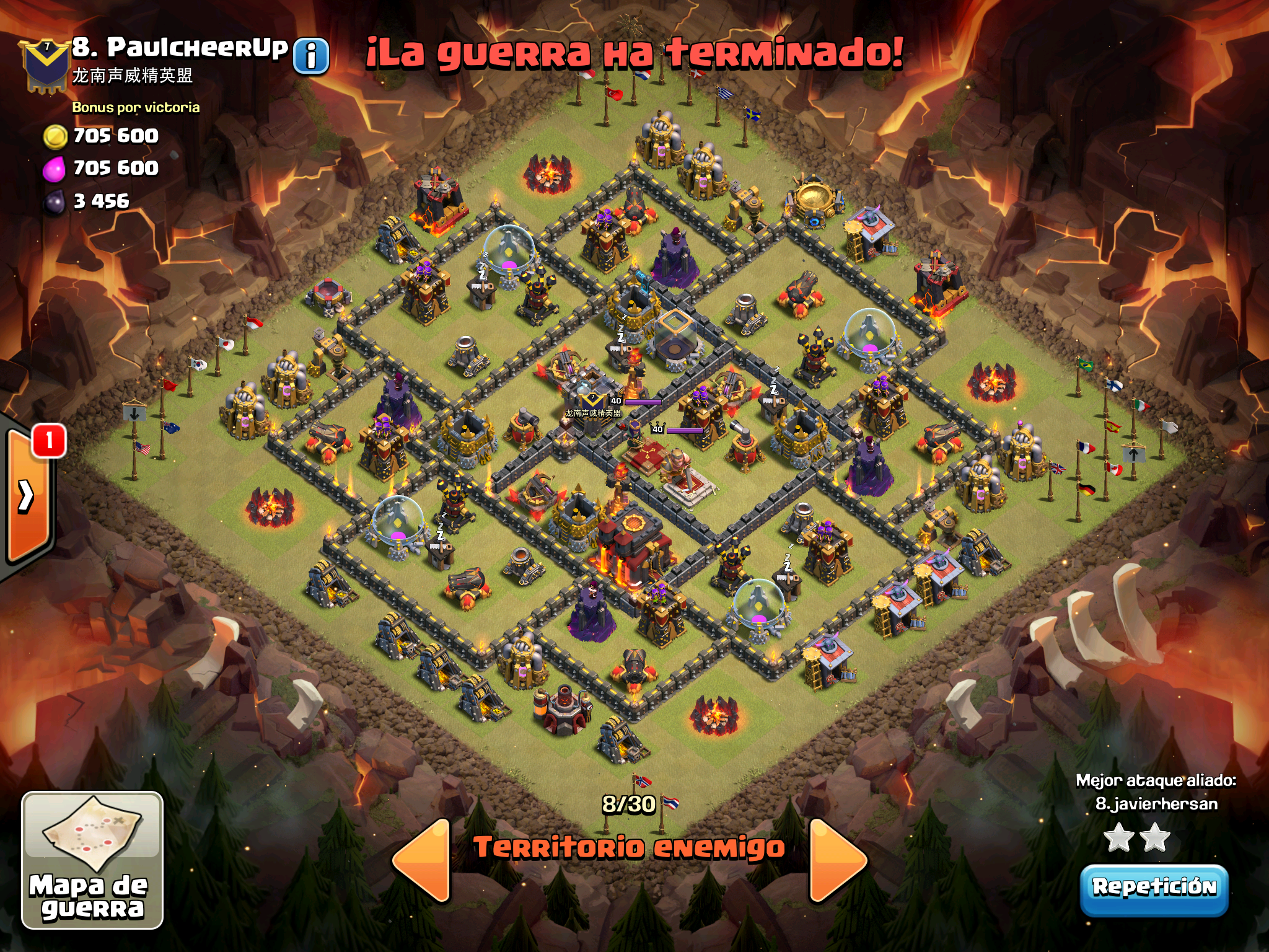 Pues si pensabais que la guerra contra Supremacia Br estaba desequilibrada esta lo vais a flipar.: Todos los TH10 de este clan chino estan al MAXIMO de defensas y heroes. TODOS. Los TH9 hasta bastante abajo calzan tambien heroes 30 y muros al 10… asi que cuando empeze a mirar la guerra lo flipe.