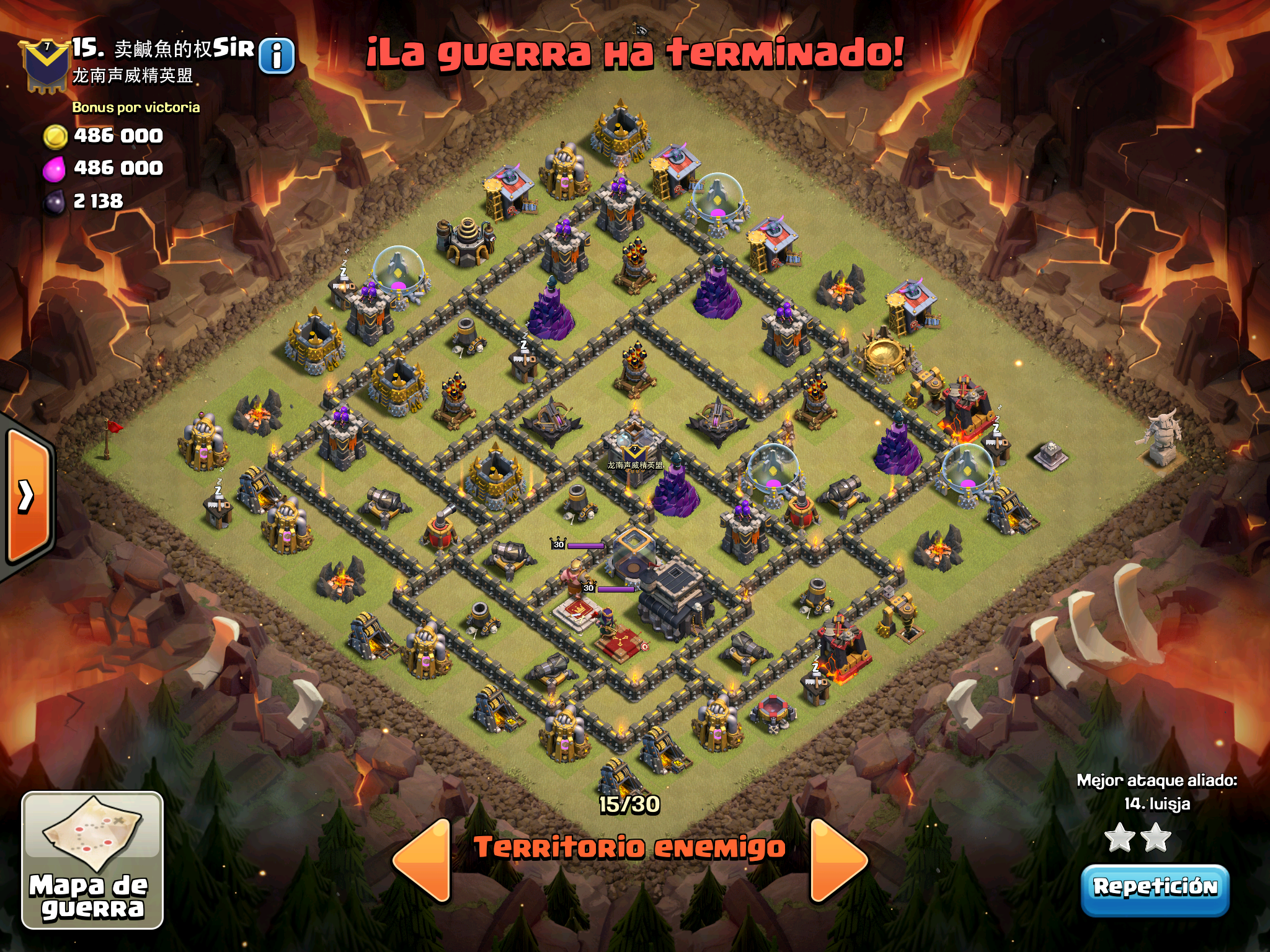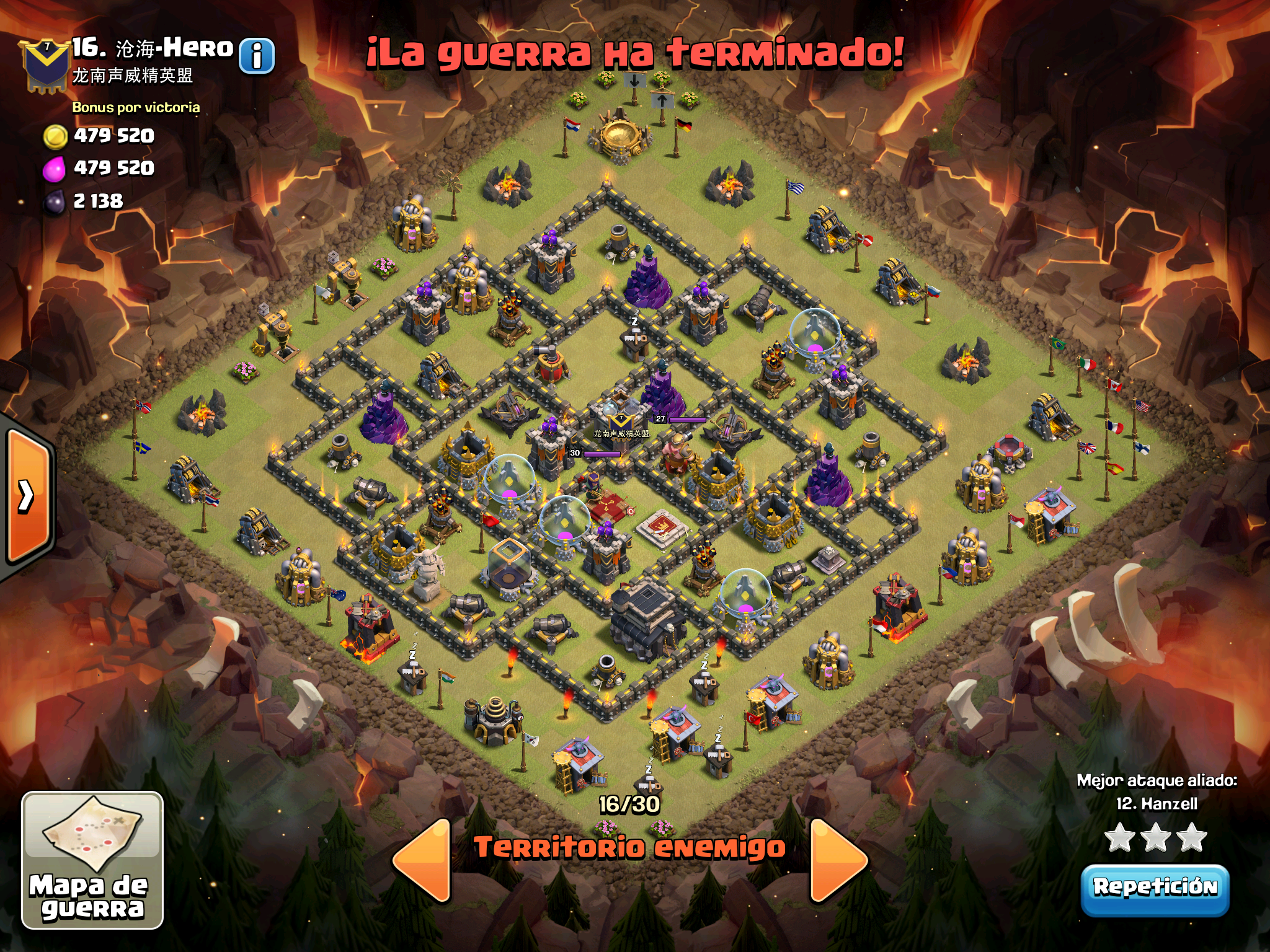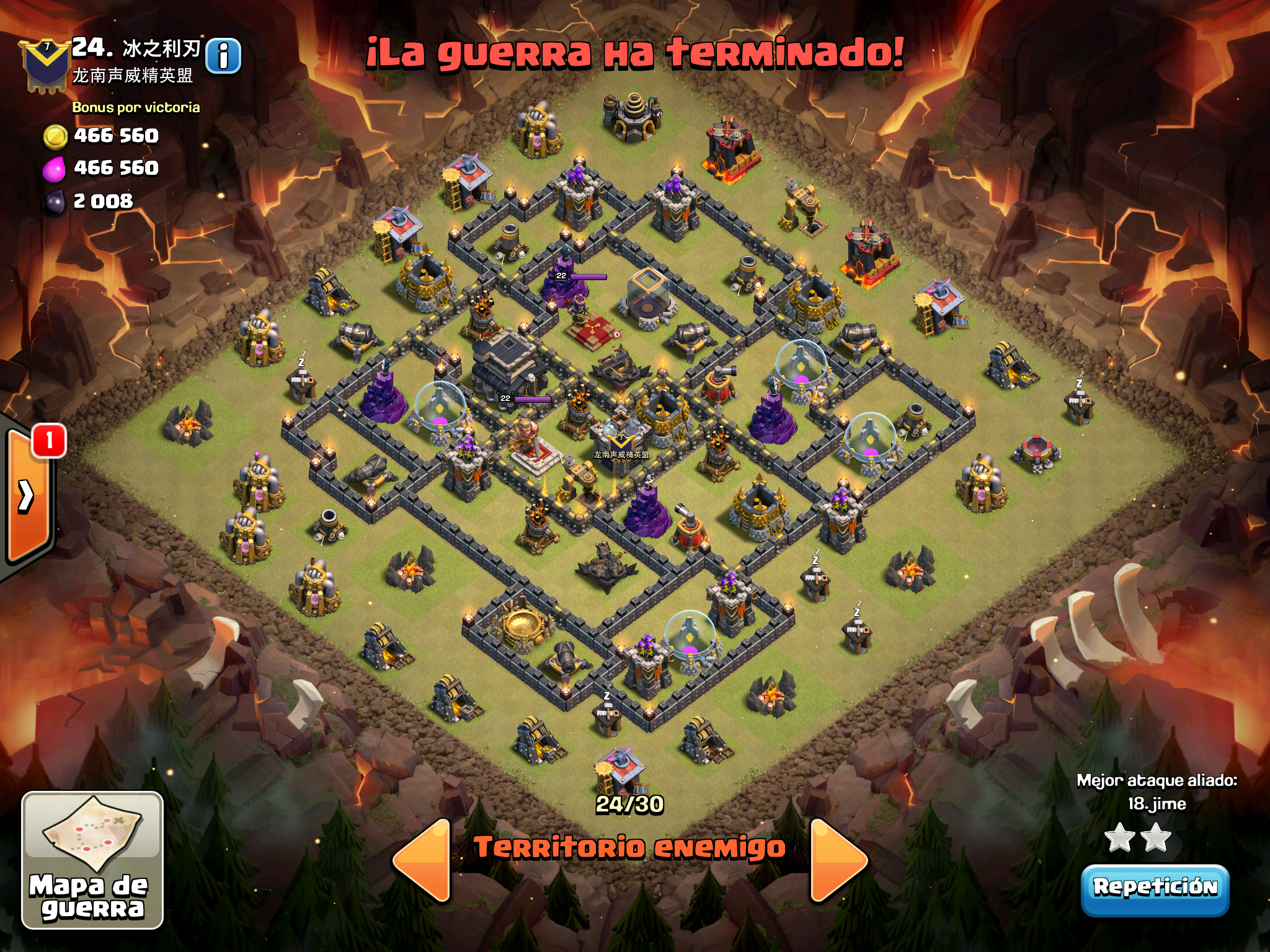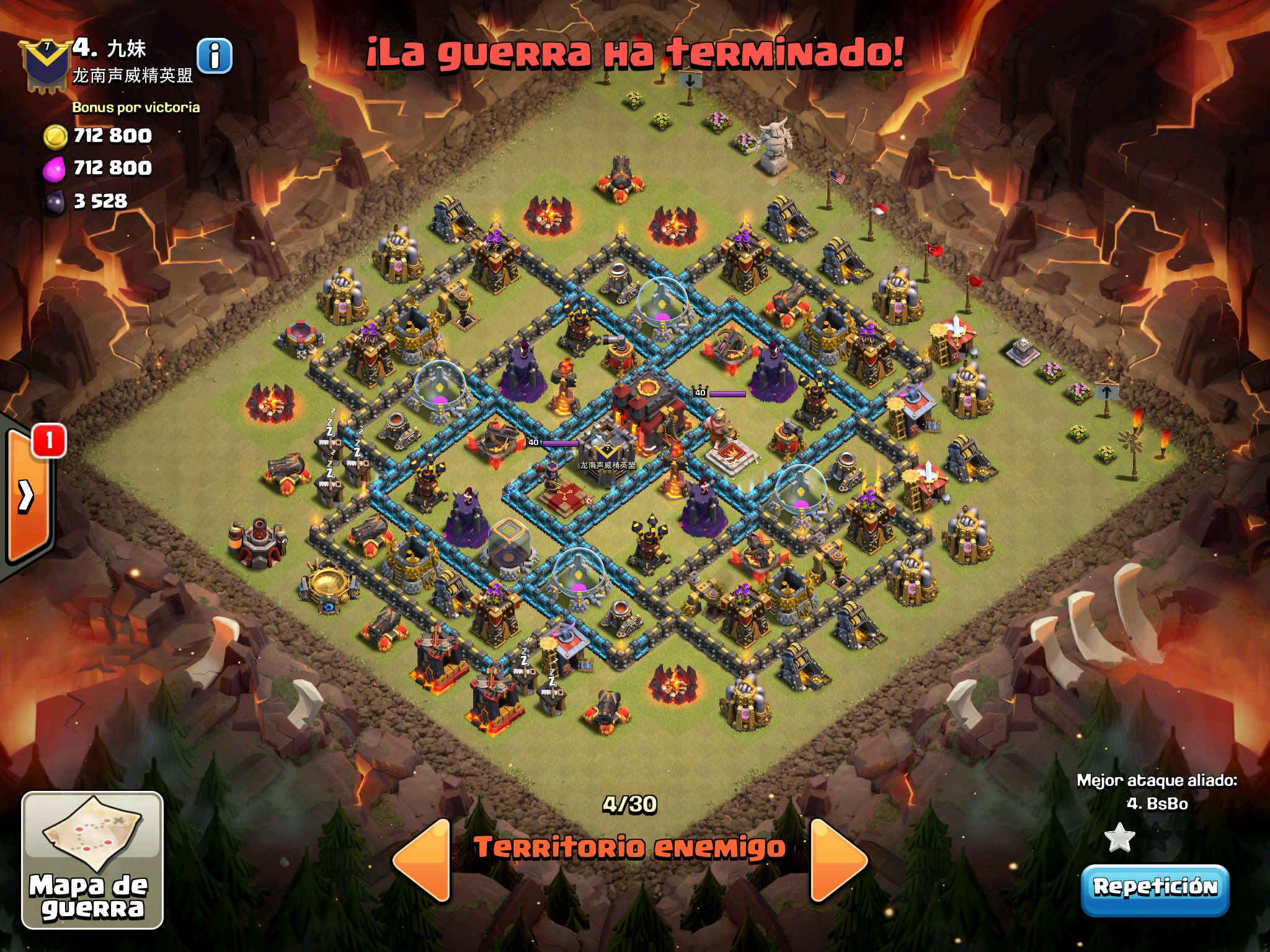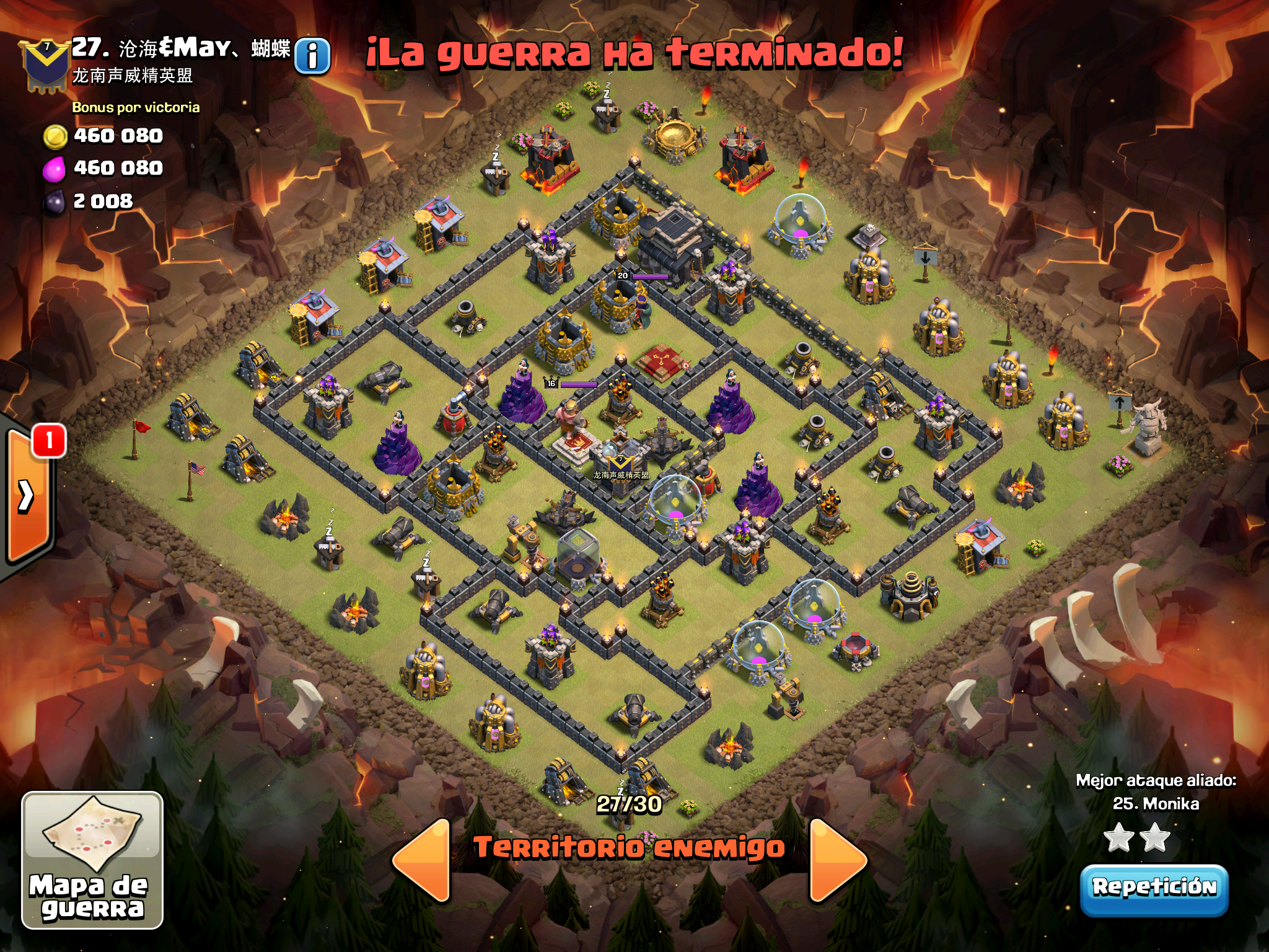 Pues si pensabais que la guerra contra Supremacia Br estaba desequilibrada esta lo vais a flipar.: Todos los TH10 de este clan chino estan al MAXIMO de defensas y heroes. TODOS. Los TH9 hasta bastante abajo calzan tambien heroes 30 y muros al 10… asi que cuando empeze a mirar la guerra lo flipe.
