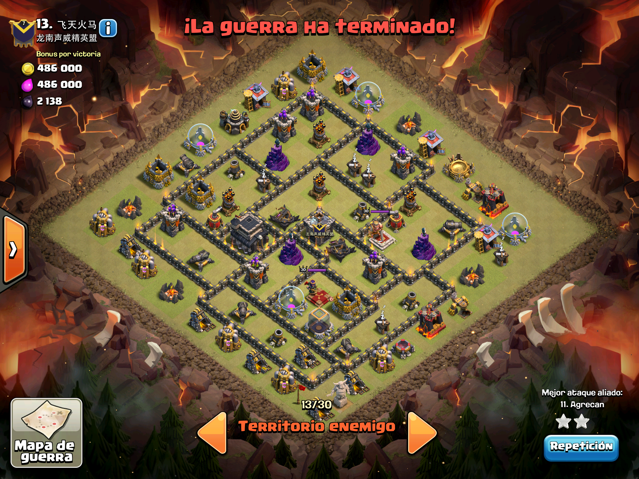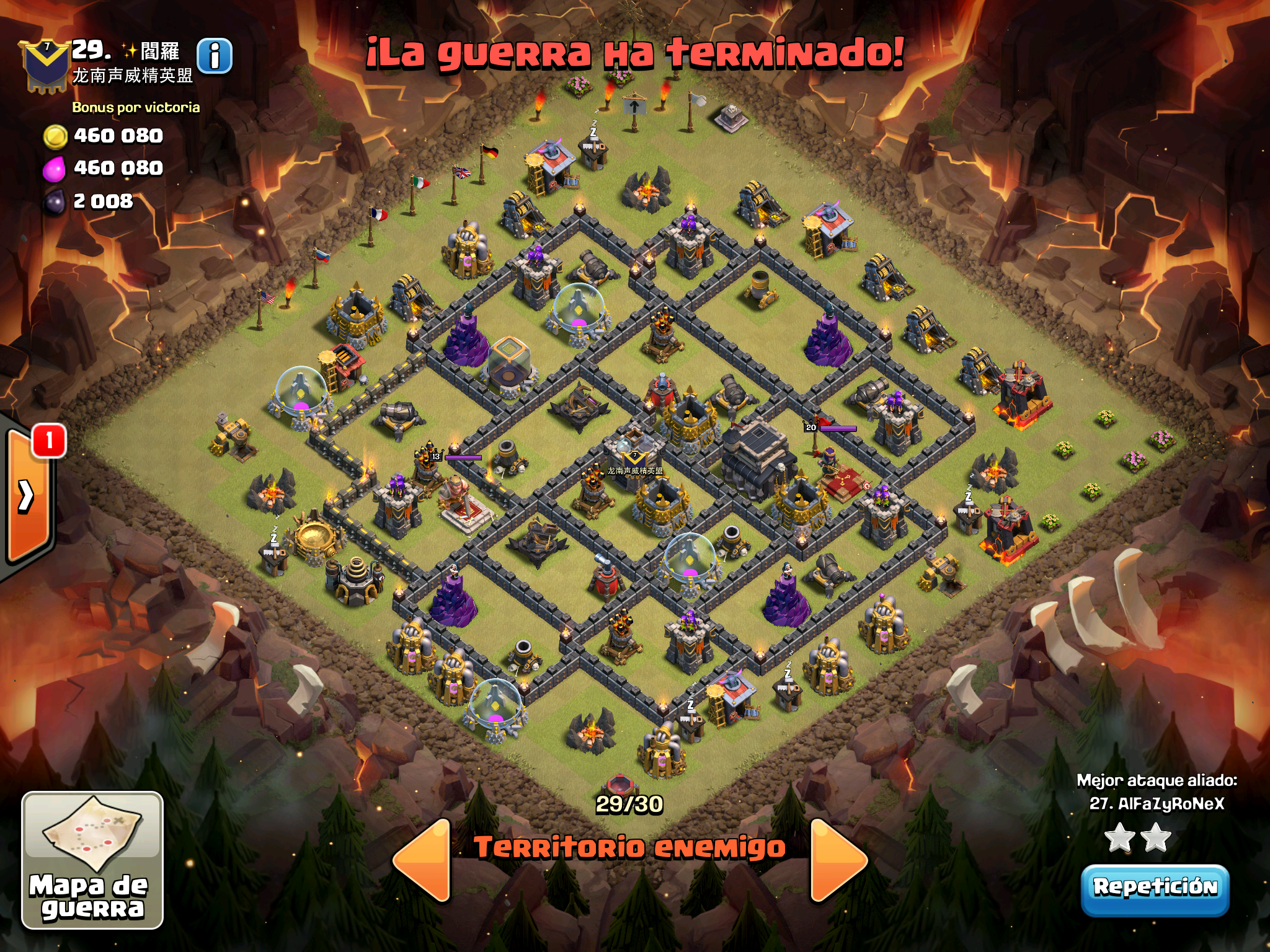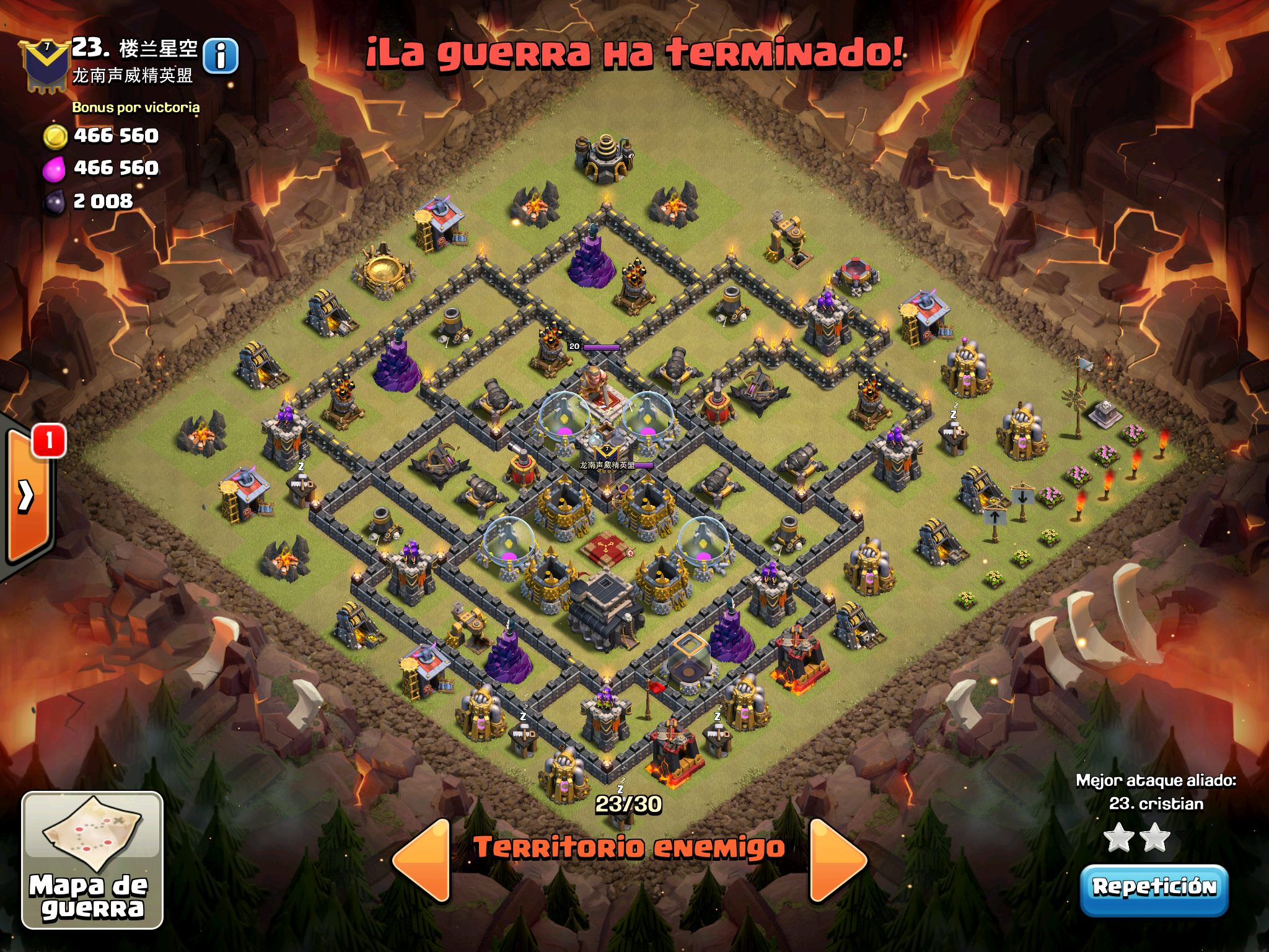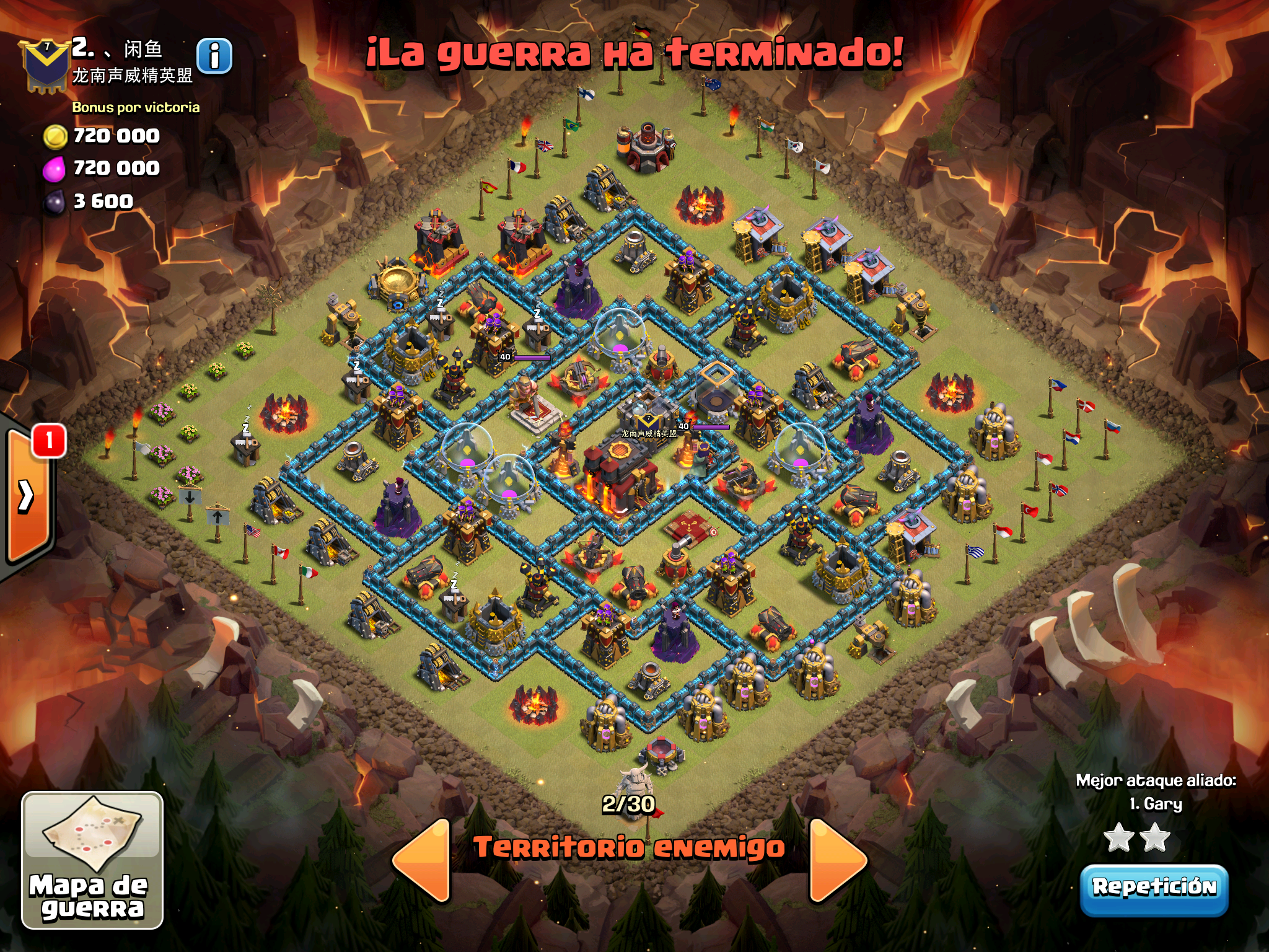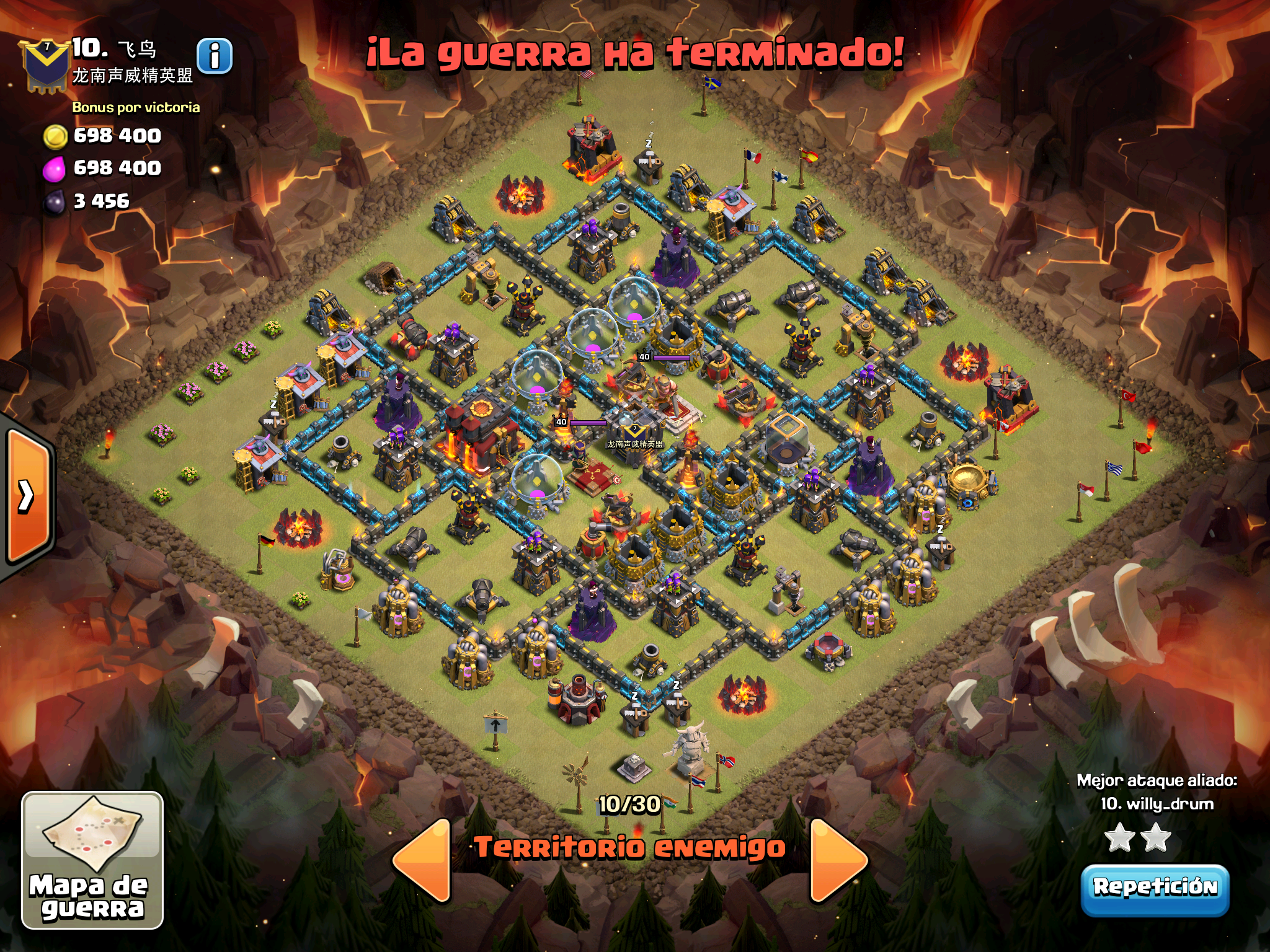 Pues si pensabais que la guerra contra Supremacia Br estaba desequilibrada esta lo vais a flipar.: Todos los TH10 de este clan chino estan al MAXIMO de defensas y heroes. TODOS. Los TH9 hasta bastante abajo calzan tambien heroes 30 y muros al 10… asi que cuando empeze a mirar la guerra lo flipe.