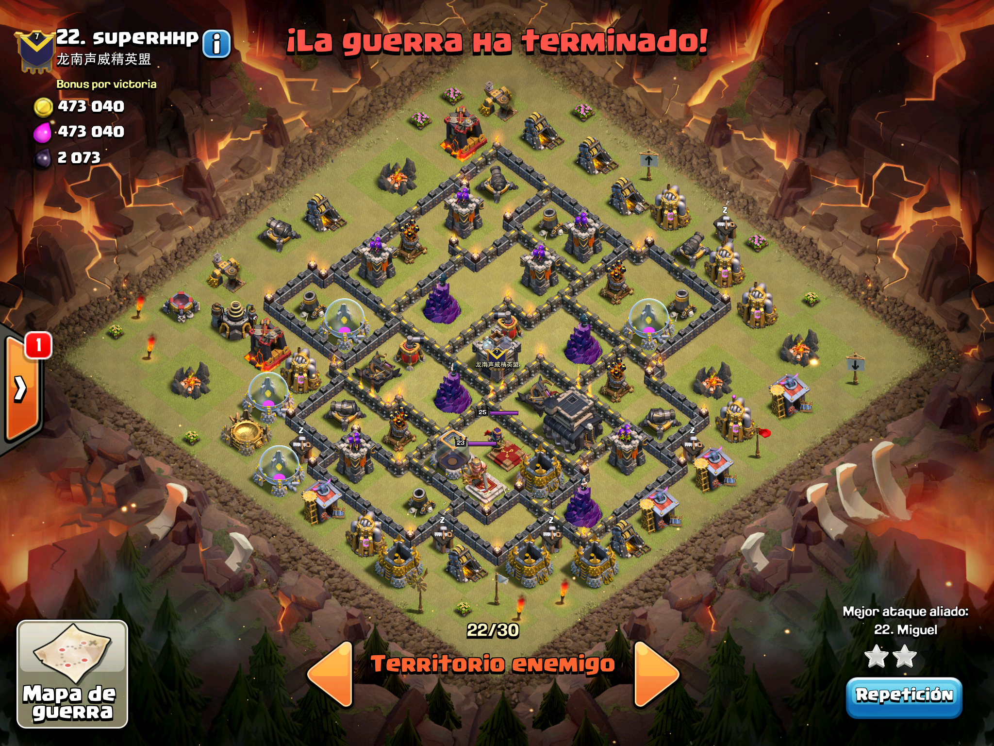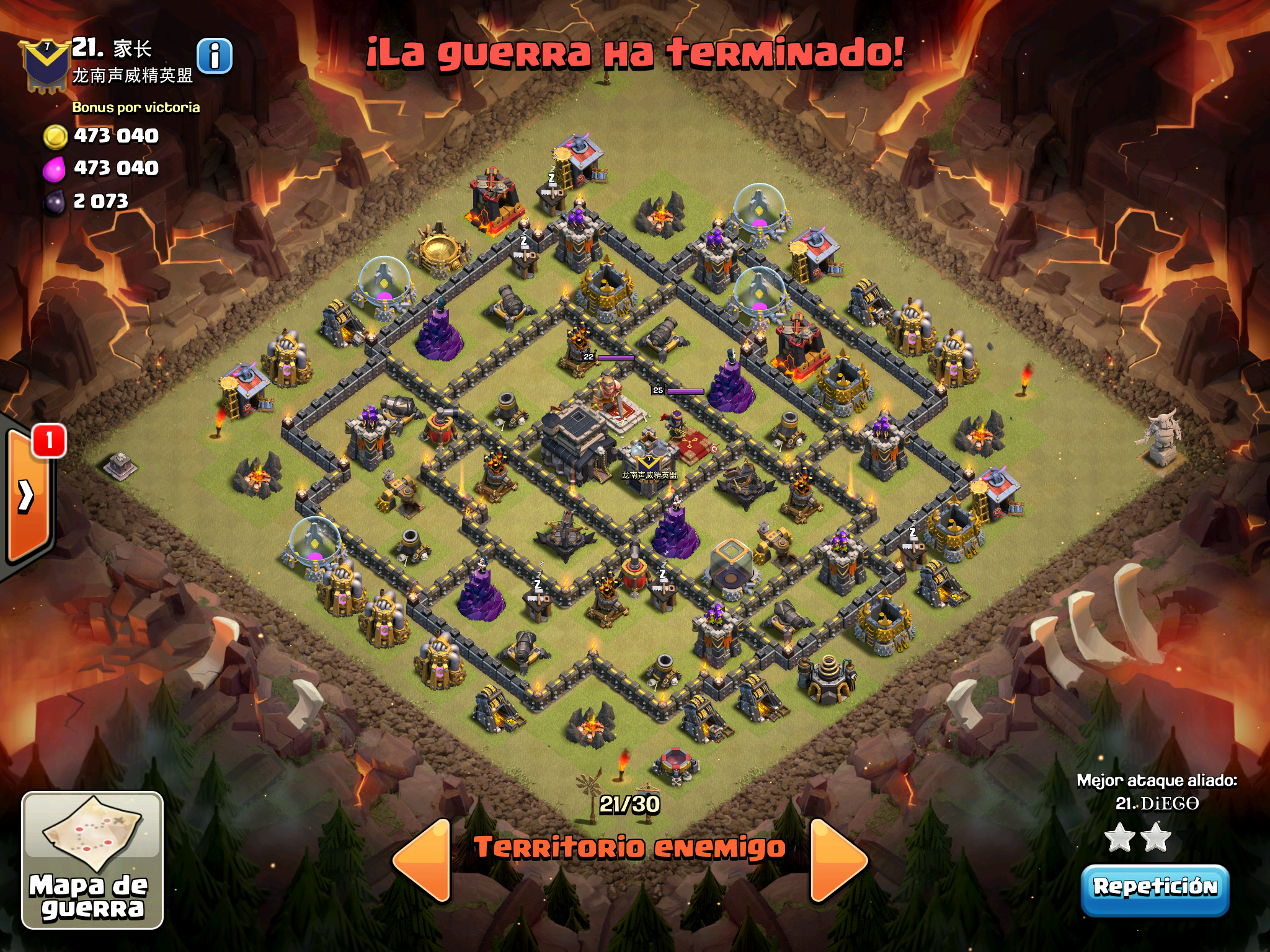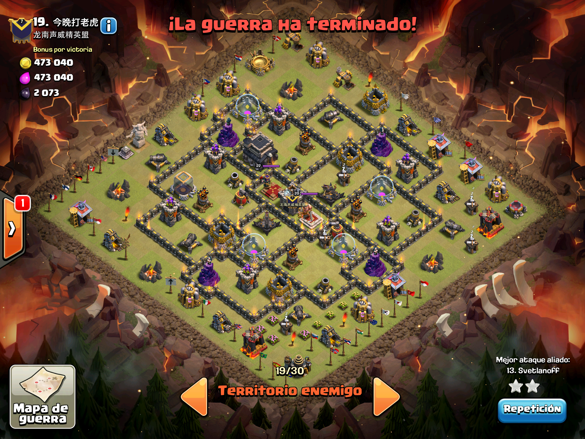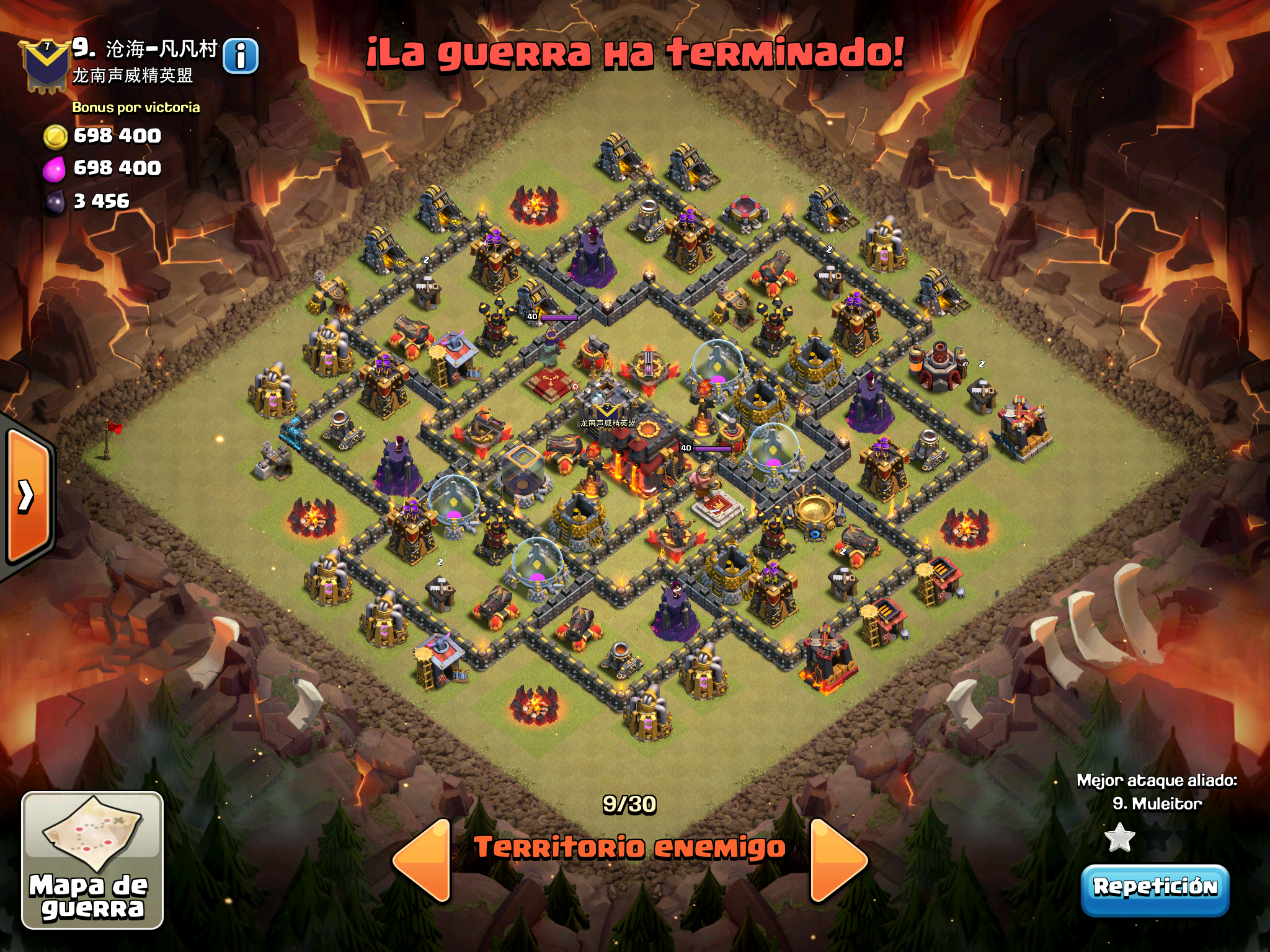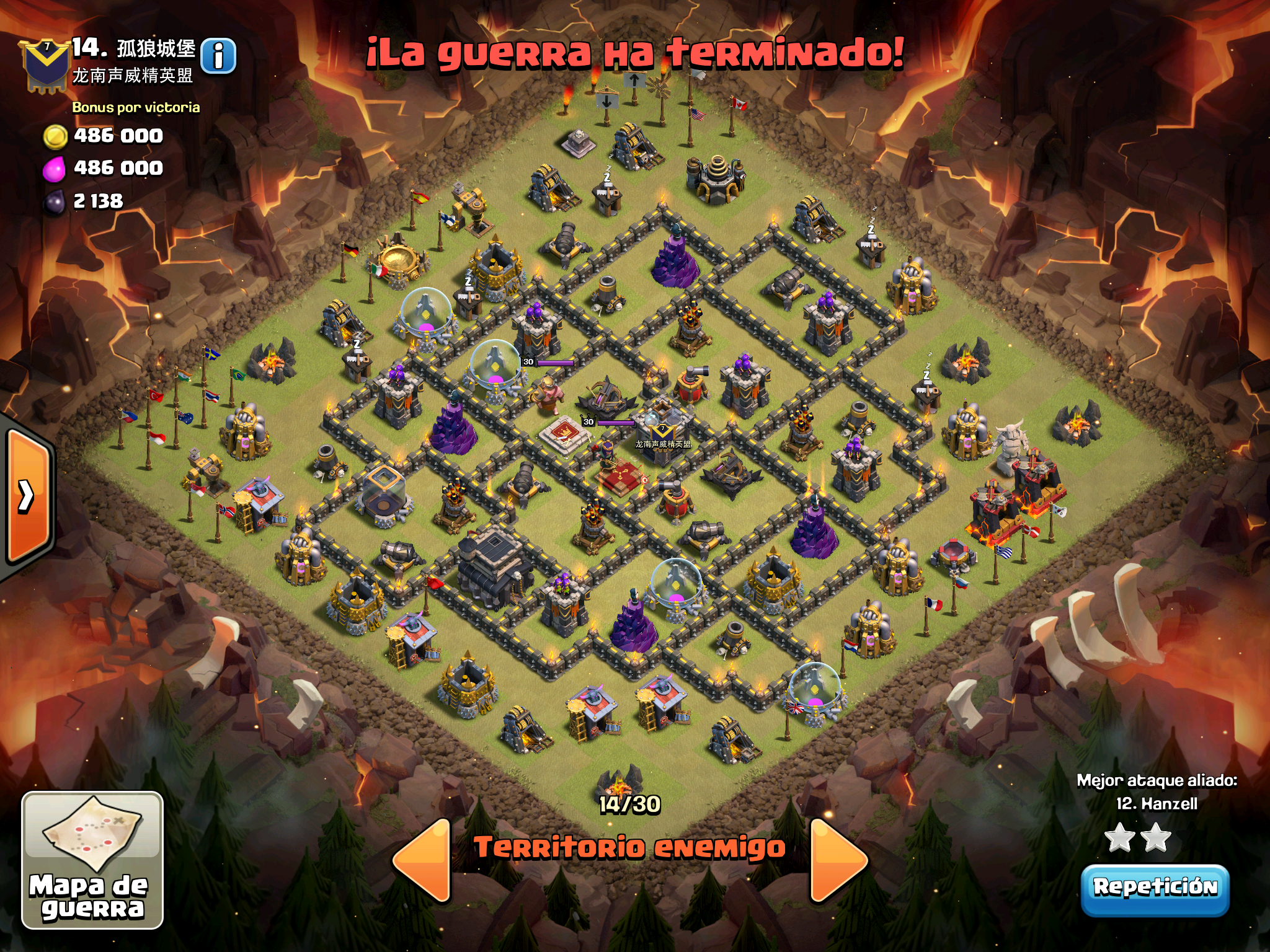Pues si pensabais que la guerra contra Supremacia Br estaba desequilibrada esta lo vais a flipar.: Todos los TH10 de este clan chino estan al MAXIMO de defensas y heroes. TODOS. Los TH9 hasta bastante abajo calzan tambien heroes 30 y muros al 10… asi que cuando empeze a mirar la guerra lo flipe.