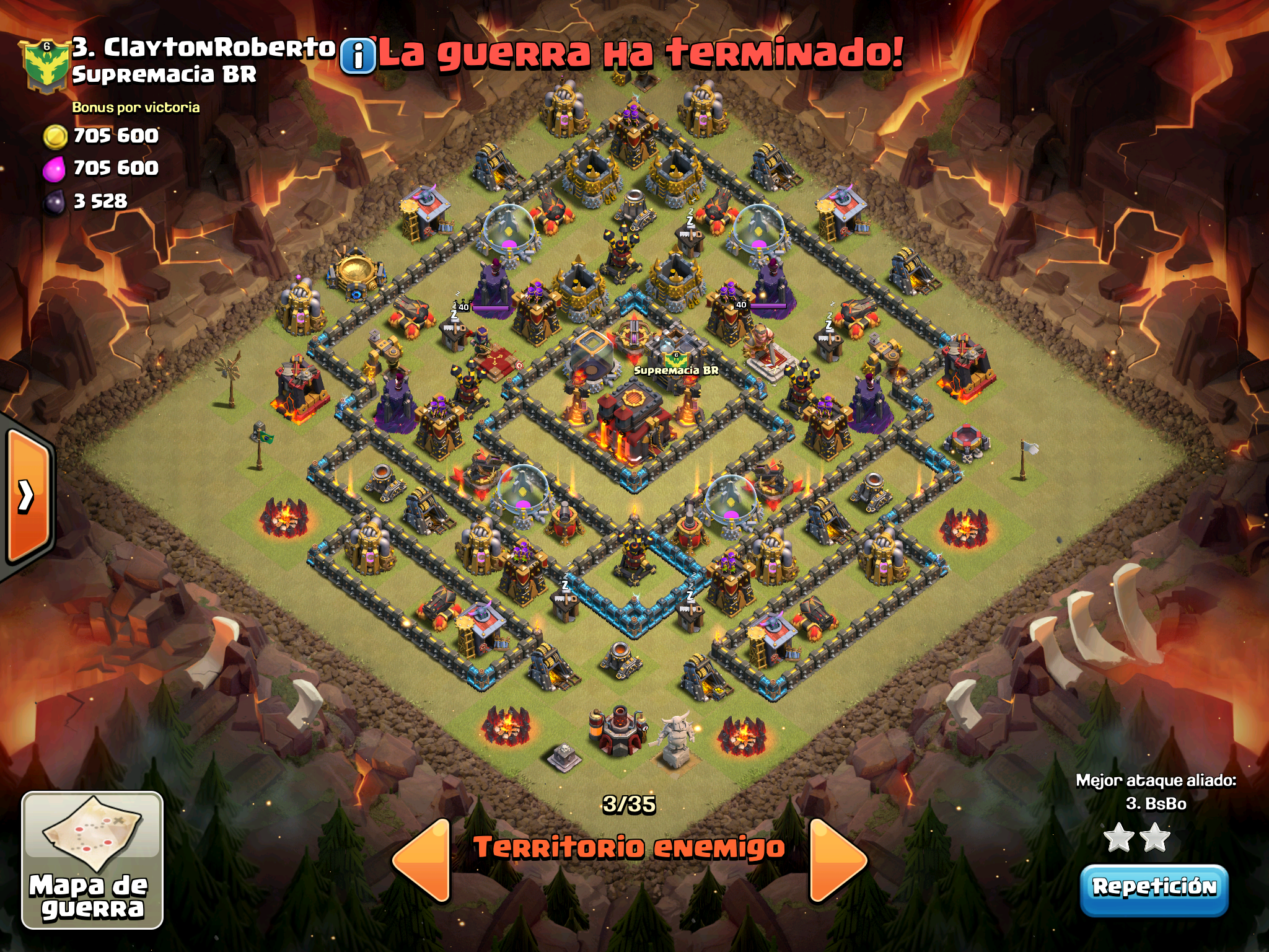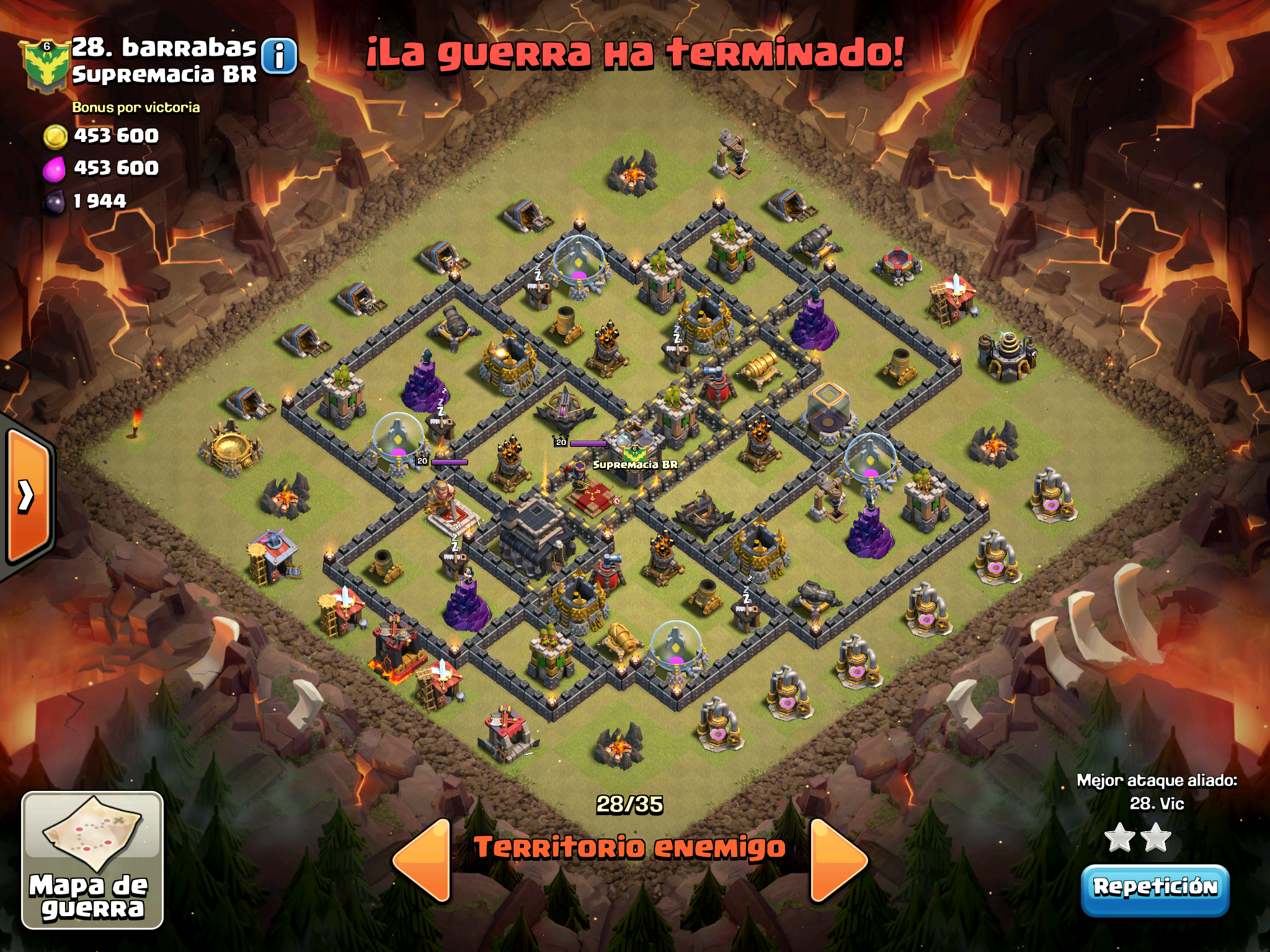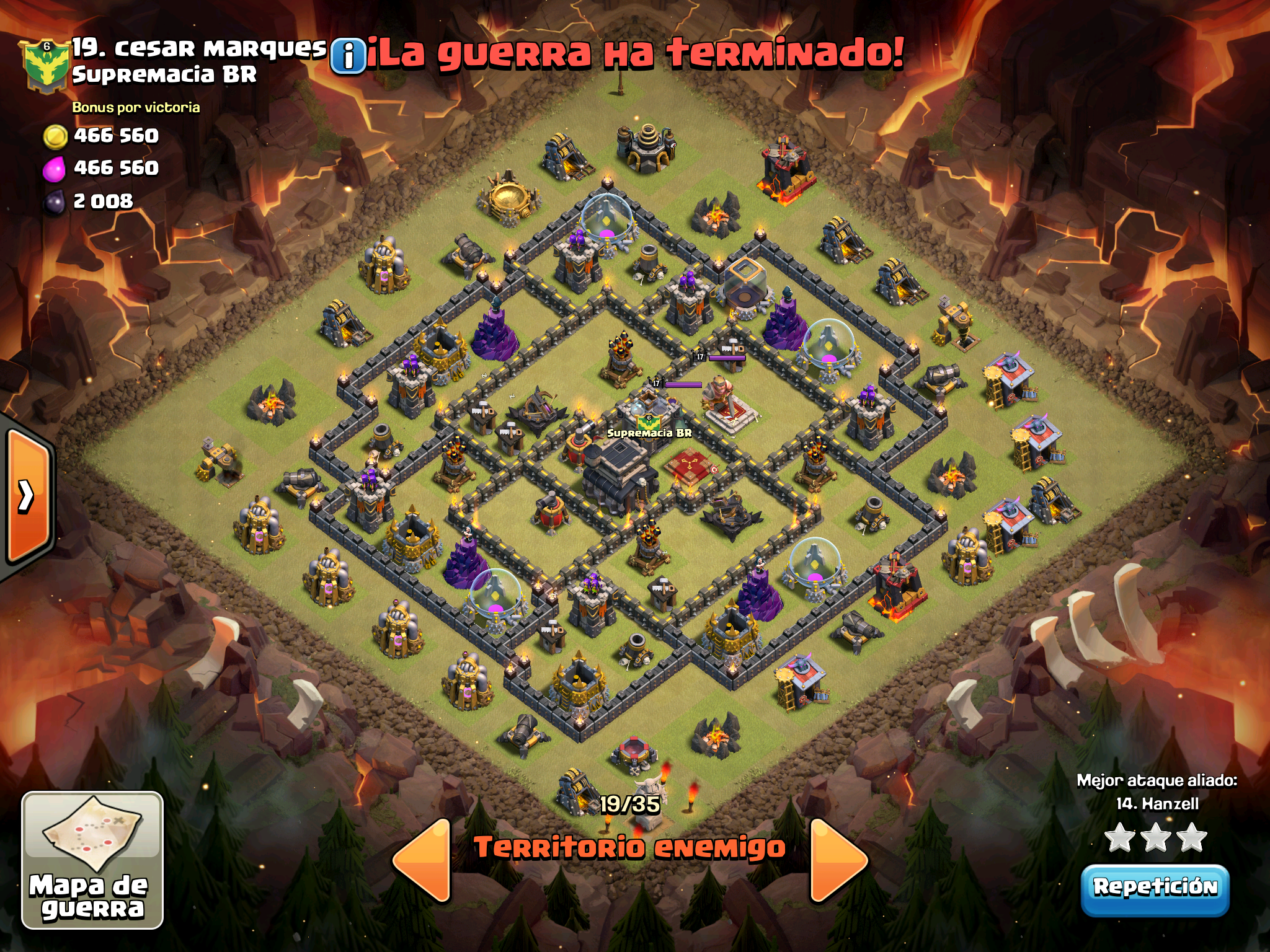 Supercell claramente nos odia y le gusta vernos perder… nos empareja contra mas TH10, contra aldeas con muros al maximo, contra heroes 40, pero nosotros hay con dos cojones hemos dado guerra y al final nos ha faltado un pelo. Este es el directo que hicimos de guerra y la verdad que se ven ataques muy chulos y tecnicas bastante interesantes.